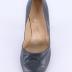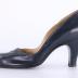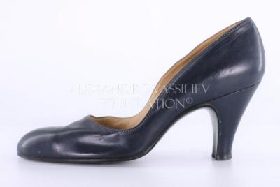Left foot of a woman's smooth navy blue leather on a a high heel. The winding rim around the foot is trimmed with sewing.