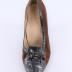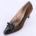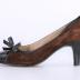 Left foot of a woman's shoe on a high heel. The shoe is decorated on the pointed toes with a bow. The front, heel and rim parts are ornamented with black crocodile's imitation leather and the sides with brown suede leather.
