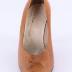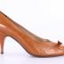 Right foot of a woman's light brown leather pump with stiletto heel. Pointed toes decorated with a bow partly inlaid in the shoe.