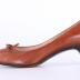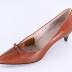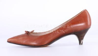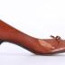 Left foot of a woman's light brown shoe with a little heel. Pointed toes decorated with a perforated oak leaf shape and a leather bow on top.