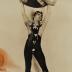 In the photo at the top right, the man wears a solid dark-colored sleeveless jumpsuit with frayed pant legs, with light-colored detailing in the center, and dark-colored dancing shoes. The woman wears a dark colored leotard, matching dance shoes and a light colored hair band.