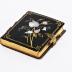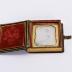 Made to resemble a book, the daguerreotype is mounted in a box made in Papier-mâché and wood painted black with gold stamped detailing and a copper clasp, The cover has a mother of pearl inlay floral arrangement. Inside of a case lined with red velvet with a damask motif etching, the portrait is behind a sheet of glass and brass frame.