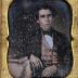 Daguerreotype photograph portrait of a young man wearing a three-piece suit with a dark-colored bowtie, and a damask waistcoat covering most of his light-hued dress shirt. Attached to the top button of his waistcoat and tucked behind the wide lapels of his dark jacket is a watch fob. The photograph is manually retouched with gold pigment overtop the watch fob. The gentleman's hair is parted above his right eye, smoothed out overtop, and curled out by his ears. His right arm is resting on the table beside him with a floral tablecloth and two books. His left hand is in his lap.