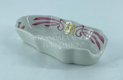 Small ashtray with painted pink ribbons and the letter "M" on both sides. The item from the restaurant "Maxim".