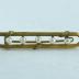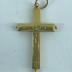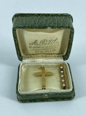 A golden cross with floral engraving, and a geometric brooch decorated with tiny mother or pearls. The cross set comes in a small green box with ivory silk lining.