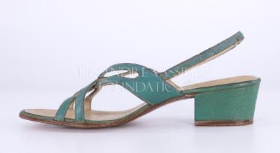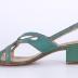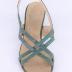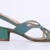 Right foot of a woman's turquoise leather sandal, with open toe and back, with criss crossed straps and low and large heel.