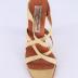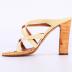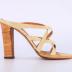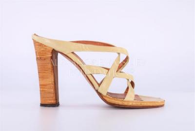 Right foot of a woman's high square heel summer sandal, with no back, made of wood with leather stripes in pale yellow colour.