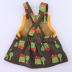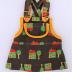 Children's pinafore with a house and apple tree pattern. The chest panel and pocket are lined with orange ribbed cotton fabric secured with a cover stitch on the inside and outside of the garment. The straps of the jumper cross over the back and are secured with orange plastic clasps and buttons on the chest. An elastic band is sewn into the back of the skirt. Yellow thread is used to assemble the garment.