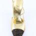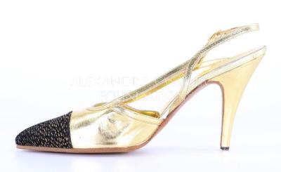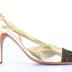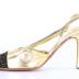 Women's metalic gold right sling shoe, on a high stiletto heel, with a black felt pointed toe box and small horizontal glitter lines. Small golden buckle on heel strap.