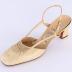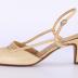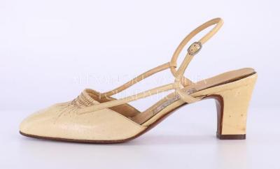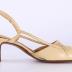 Women's left cream sling back shoe with a square kitten heel and a square toe box. Toe box has three rows of ruching at the top, and two thin straps that connect it to the back ankle strap that is fastened by a small metal buckle.
