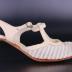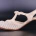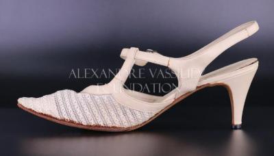 Women's right slingback heel shoe made of white leather outlining a white lace toebox. The heel is a short stilleto kitten heel and the shoe is lined with matching white leather.