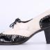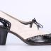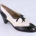 Left foot of a woman's shoe made of dark navy black leather and white suede decorated with tiny perforated holes, standing on a medium high cone heel.