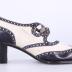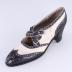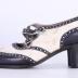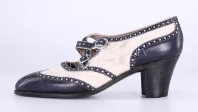 Women's left shoe made of white leather with black leather outlining with circles and spikes along the toes, heal and throat of the shoe. Shoe is fastened by two black leather crisscrossing buckels in the front. Insole is lined with white leather.