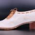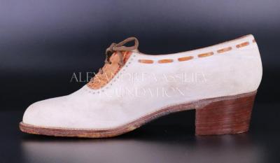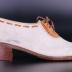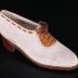Women's right shoe made of rough white leather with brown crocodile leather at the vamp and woven around the throat of the shoe and brown shoe laces fasten the shoe up the front. The bottom sole is tough rubber and there is a small box heel. The insole is lined with white leather.
