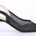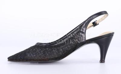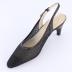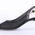 Women's right black slingback shoe with a stilleto kitten heel and a pointed toe box with see through structured black lace that extends up until the heel strap that is fastened by a buckle. The insole is lined with white leather.