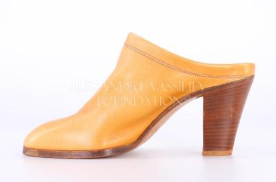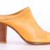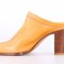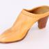 Right foot of woman's mule shoe in camel colour leather with a large high cone heel.