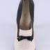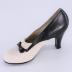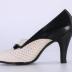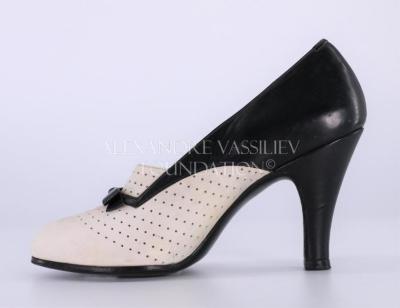 Women's right shoe made of half white leather from the toe box to meet in the middle of the shoe with black leather that begins at the heel. Thite leather has small identical holes arranged in horzontal lines. There is a black bow at the top of the toe box.