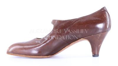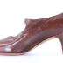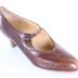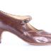 Women's right shoe made of brown leather with a strap across the arch attached to the shoe by a small brown button attached to a piece of elastic so the wearer can slide the shoe on and off.