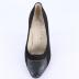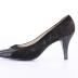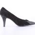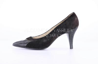 Left foot of a black suede woman's shoe with stiletto heel in shiny black leather, and the same leather on the toe.