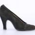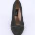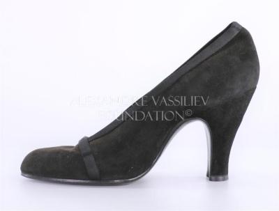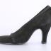 Right foot of a woman's shoe made of suede with a high stiletto heel coloured in black.