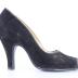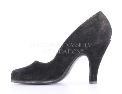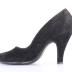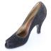 Right foot of a woman's open toe shoe made of black suede, with a high stiletto heel.