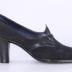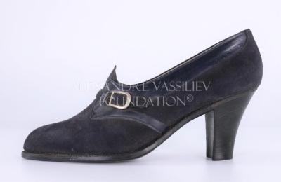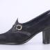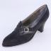 Left foot of a woman's shoe made of dark navy blue suede and leather, decorated with a buckle at the tip, with a square medium high heel.