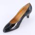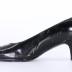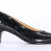 Women's right black leather pump with stitch detailing on the pointed toe box and around the throat of the heel. Insole is lined with tan leather.