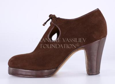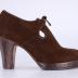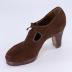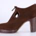 Women's brown suede right shoe with a small platform, a chunky stilleto heel, and a brown shoe lace. Shoe fully covers the foot with two cutouts on either side of the shoe. Insole and bottom sole are lined with tan leather.