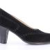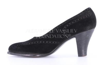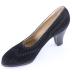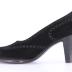 Women's left suede black pump with circular details around the throat and toe box of the shoe and tan leather lining the insole.