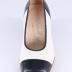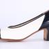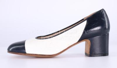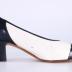 Left foot of a woman's modernist design shoe on a square heel. The square toe and heel are in black leather, the rest is in white.