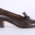 Right foot of a woman's loafer in brown leather on a square heel. The shoe is decorated on its squared front part with a breaded piece of leather.