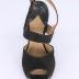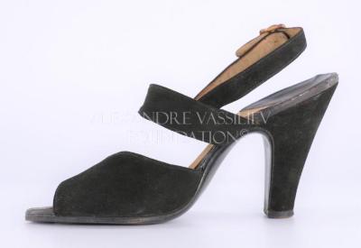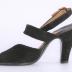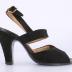 Right foot of a woman's pump sandal in black split leather. The shoe is peep-toed, and a strap closed with a metal buckle is maintaining the heel.