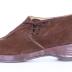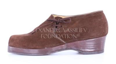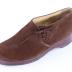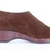 Left foot of a woman's shoe in brown split leather on a small wedge heel. The shoe is in clog shoe shape and attached with a 3 eyelets shoelaces on its left side.