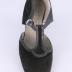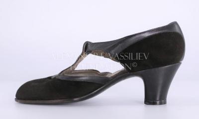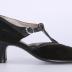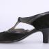 Right foot of a woman's square heel shoe made of black suede and leather, decorated with a metal buckle.
