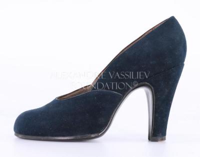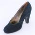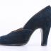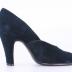 Left foot of a woman's pump in black suede and leather on a high heel.