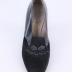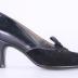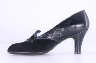Right foot of a woman's pump in black suede and smooth leather on a middle-size heel. The shoe is decorated on its front part with a wavy flap and a bow.