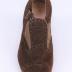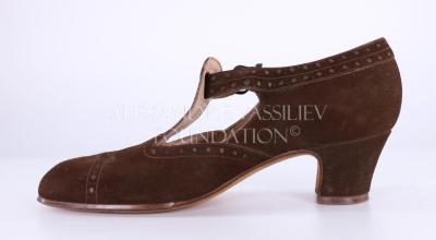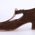 Right foot of a woman's shoe in brown suede and leather on a little heel. The pump is decorated with perforated saddle-shoe style and attached with a metal buckle.