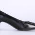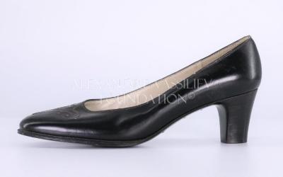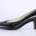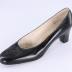 Left foot of a woman's pump in black leather with a medium high square heel. The shoe is decorated on its front square part with perforated and sewing patterns.