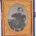 Oval ambrotype portrait of a young child wearing a dark dress with three-quarter balloon sleeves, six buttons down the bodice, and a pleated skirt attached to the bodice. Encasing the buttons are two vertical lines of fabric detailing, and three rows of matching detailing encircles the skirt hem. The child is wearing dark shoes with shoe laces and their straight hair is cut short with a side part on the left of their head. They are sitting in a wooden chair next to a dark object with a flat top.