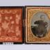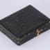 The portrait comes in a black paper mâché box that is fastened by a brass hook clasp. The top of the box is lined with red velvet with floral motifs carved into it. Encircling the portrait is a golden plate with floral motifs carved into the plate. Framing the plate is a golden frame with zig-zag line and dot detailing, as well as floral detailing in the corners.
