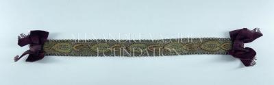 Leather garter vegetal motif embroideries and silver beads on the edges, lined with burgundy silk and decorated on the ends with bows made of the same fabric.