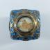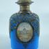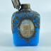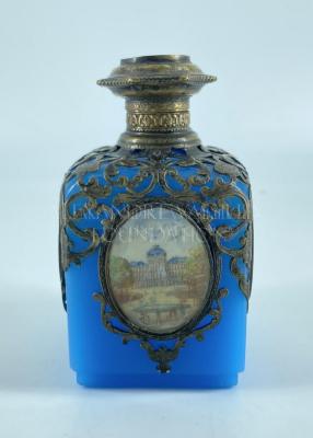 Blue glass smelling salts bottle with an openwork pinchbeck top embellished with pictures on the top and on the sides representing a picture of French landmarks, and a small crystal plug under the lid.