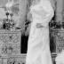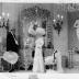 A paper photograph depicting a scene from the film "Myra Breckinridge" with Mae WEST as Leticia Van Allen opposite John HUSTON playing Buck Loner in a lavishly decorated room in front of a large vanity. Mae WEST is dressed in a white floor-length A-line dress with a plunging collared neckline, padded shoulders, and three fermeture passementerie button closures. Atop her head is a juju hat of white feathers with the matching boa fixed on the back of the vanity chair. John HUSTON is wearing a suit adorned with a western-style belt and belt buckle with matching ornamentation as his dark cowboy boots. His shoes have deep scallops, president-style collars, light medallions on the shaft, and Las Vegas style wingtips. He has on a light dress shirt, suit jacket, and neck scarf bowtie. In his hand is a large pale cowboy hat.