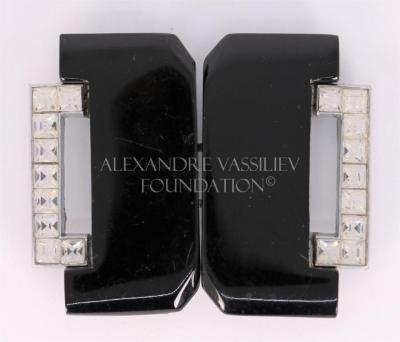 Black celluloid Art Deco belt buckle, metal mounted and decorated with square rhinestones on both sides.