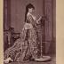 Paper photograph pasted on cardstock depicting actrice Gabrielle Thérèse COUSSIN known as Mademoiselle LINDA. She is wearing a bustle plaid dress of tartan silk with a gathered-up overskirt supported by a trained bustle. The dress has a short-waisted bodice with a neckline trimmed with sheer ruffles and ¾-length ruffled sleeves. The skirt is ornamented with ruffles, ruching, and tassels. The woman’s hairstyle reflects the silhouette of her dress in a waterfall style with knots and braids that cascade long curls down the back. The woman is posed next to a parrot on a post.