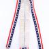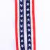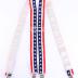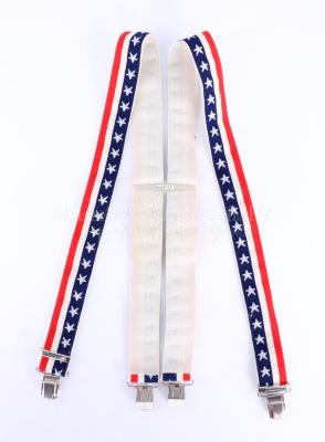 Pair of braces consisting of two American flag striped elastic ribbons on the front, creating an X in the back with a long rectangular white semi transparent plastic detail. Each strap has a repetitive pattern of white stars in the blue stripe, with white and red stripe near. They are adjustable with silver metal mecanisms on the front, and secured with clip closures on the bottom with engraved striped pattern on the back of each clip.