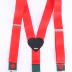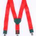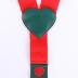 Pair of braces consisting of two red elastic ribbons on the front, creating a V in the back with a central elastic band, reinforced with a green and black leather patch on the top in the shape of a heart. The straps are adjustable with silver metal mecanisms on the front, and secured with clip closures on the bottom with a leather square on the top of each clip with a felt red heart.