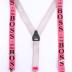 Pair of braces consisting of two pink elastic ribbons on the front, creating a V in the back with a central elastic band, reinforced with a black leather triangle patch on the top with rounded edges. The straps have a repetitive motif of printed in black phrase "I am the BOSS", and are adjustable with silver metal mecanisms on the front, and secured with clip closures on the bottom.