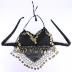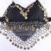 Black sheer chiffon fabric belly dance crop top, made of an upper bra fastening on the neck and the back with braces, and a triangle front part falling down the belly. All framed with black crochet net with round golden coins making sound, big and small round plastic golden beads.