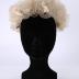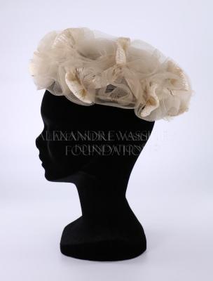 High beret shaped hat made from a celluloid thread knitted net, like a tulle, pleated and folded, with a white straw band going along the folds, the whole creating a cloud style ornamentation.